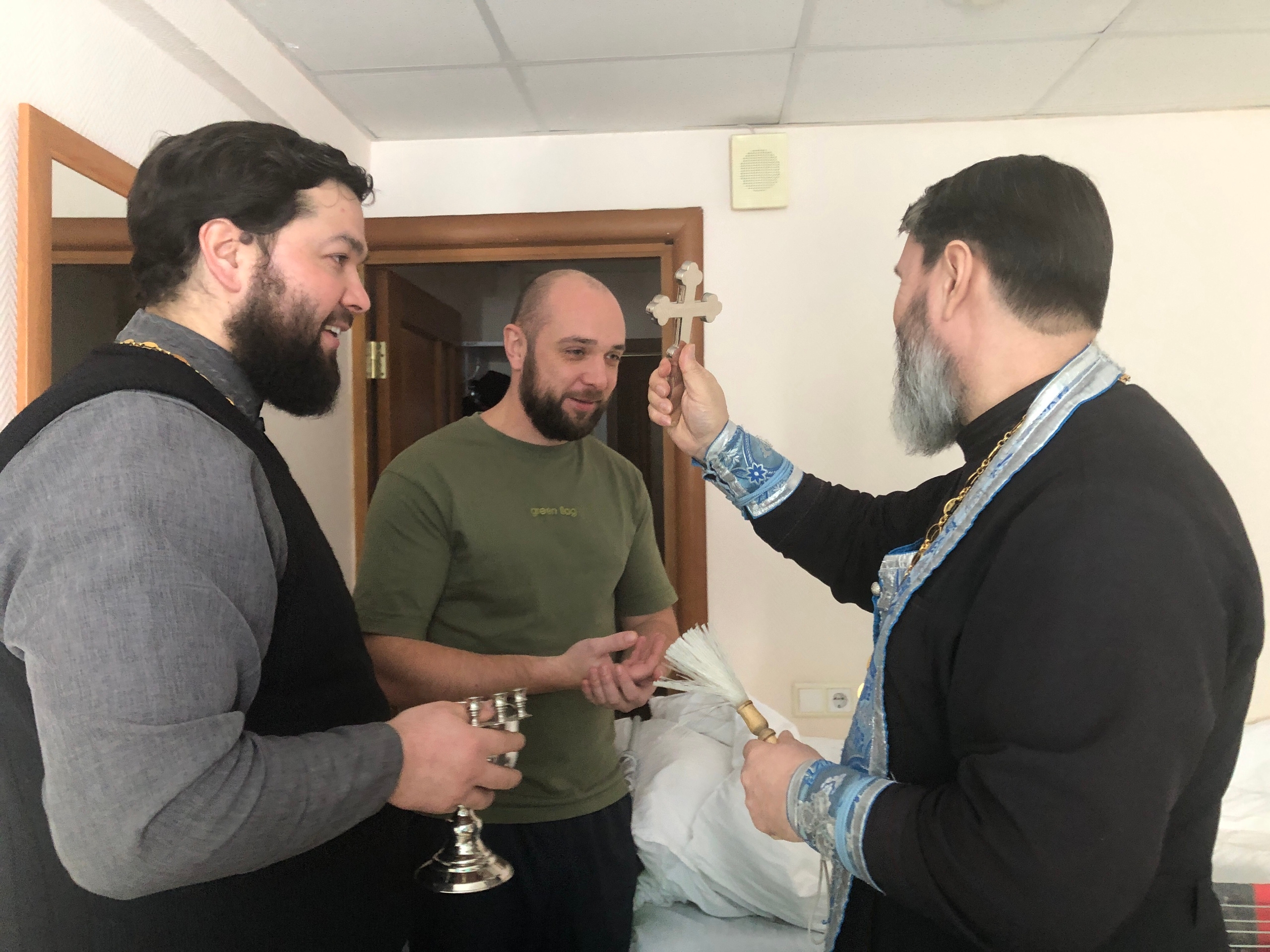 Священники совершили водосвятный молебен для подопечных Центра и окропили молящихся святой водой. Затем состоялась беседа священников с сотрудниками учреждения и пациентами, многие из которых являются ветеранами боевых действий.