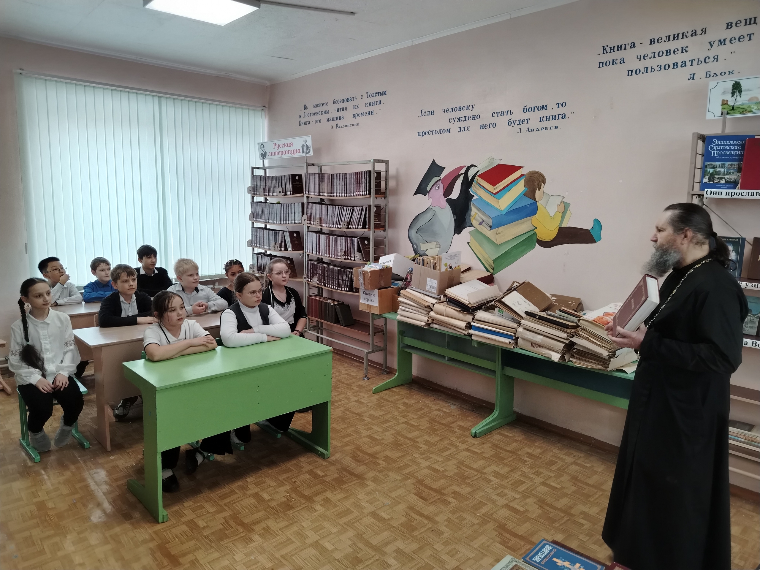 3 марта в школе с. Подлесное состоялась встреча учащихся 4 класса, классного руководителя В. В. Фоменковой, сотрудника школьной библиотеки А. Ю. Хамитовой и священника Владимира Заграничнова. Отец Владимир рассказал ребятам о Библии, об истории книгопечатания на Руси и познакомил с современными православными печатными изданиями.