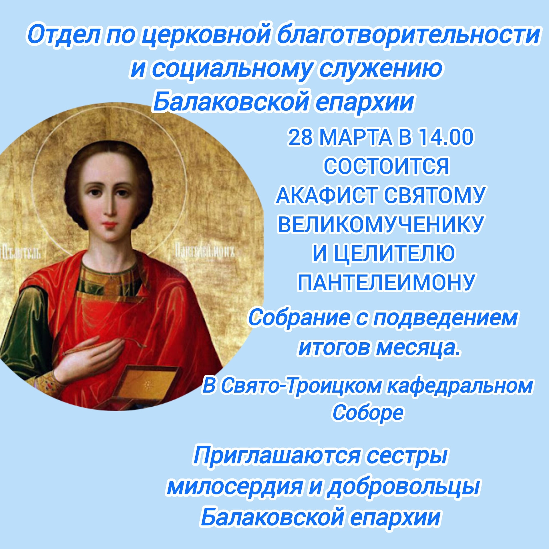 28 марта (суббота) в 14:00 отдел по церковной благотворительности и социальному служению Балаковской епархии приглашает сестёр милосердия, добровольцев и всех желающих на молебен с акафистом святому великомученику и целителю Пантелеимону в Свято-Троицком кафедральном соборе города Балаково . Богослужение совершит руководитель социального отдела иерей Александр Бабич.