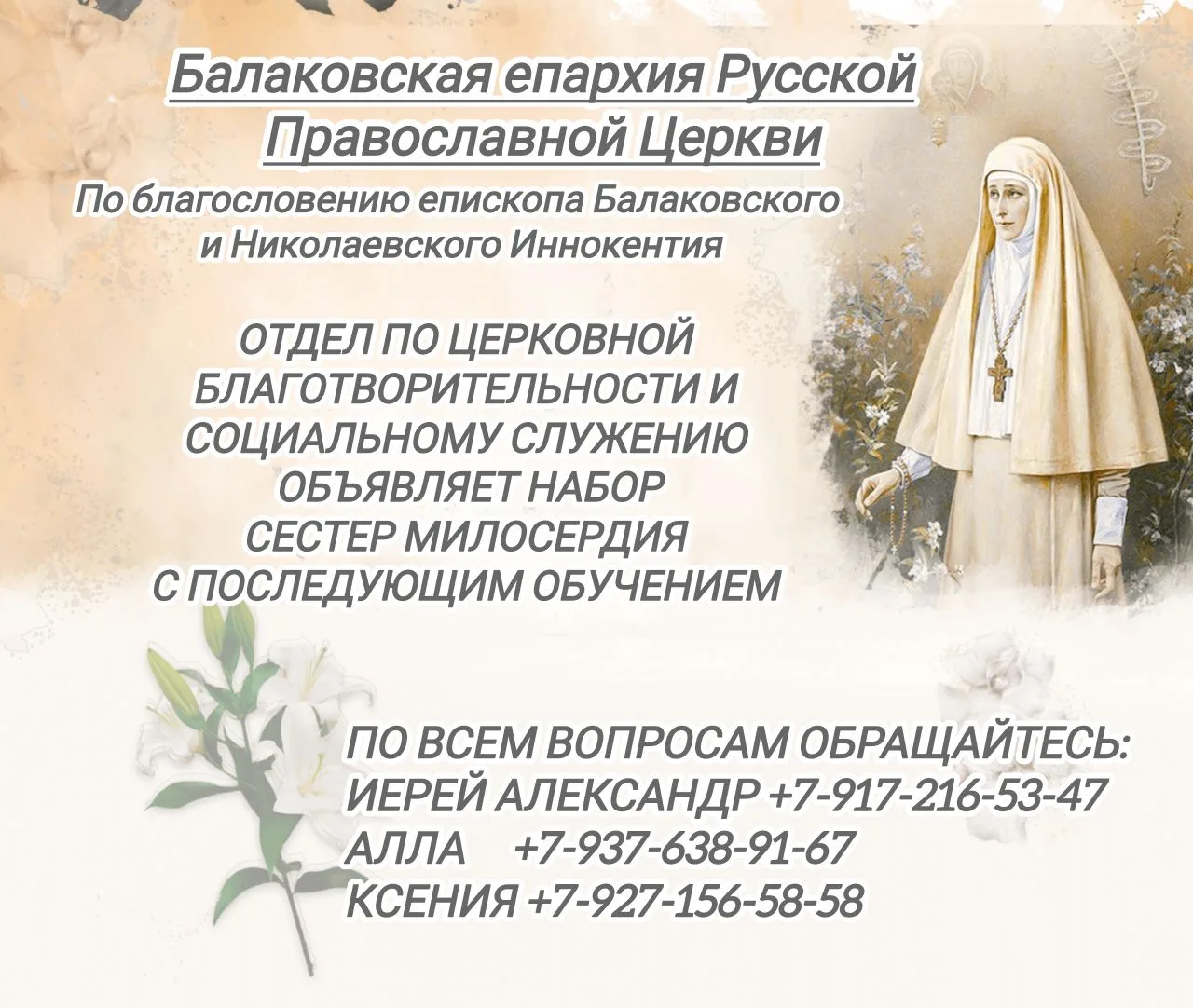 По благословению Преосвященнейшего Иннокентия, епископа Балаковского и Николаевского, сестричество милосердия во имя святой преподобномученицы великой княгини Елисаветы, объявляет предварительный набор для обучения служению милосердия и вступления в сестричество Балаковской епархии.