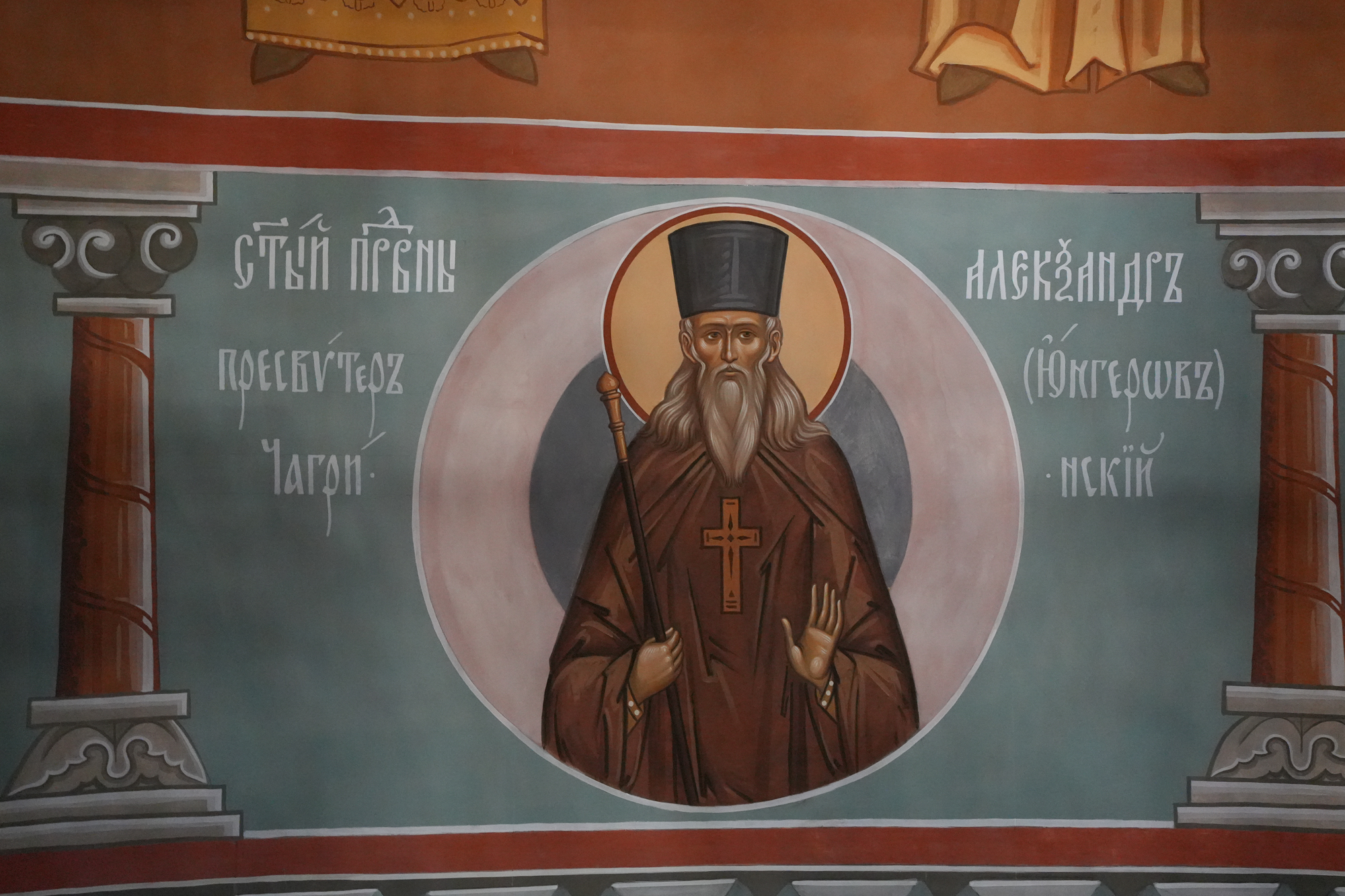 Тема единства Церквей Небесной и земной продолжается по северной и южной стенам. Это написанный в золотистом ключе сонм святых нашей Российской Церкви. Они изображены в молитвенном предстоянии Богу как участники богослужебного действия, которое неусыпно совершается в храме. Над собором Российских святых по благословению епископа Варфоломея написан текст из стихиры святителя Афанасия (Сахарова) (служба «Всем святым, в земле Российской просиявшим»): «Русь святая, храни веру православную, в ней же тебе утверждение». Подчеркну, что идея изобразить сонм русских святых на северной и южной стенах принадлежит именно Ф. Шехтелю. Мы же в меру сил постарались соблюсти преемственность в духовном обновлении собора.