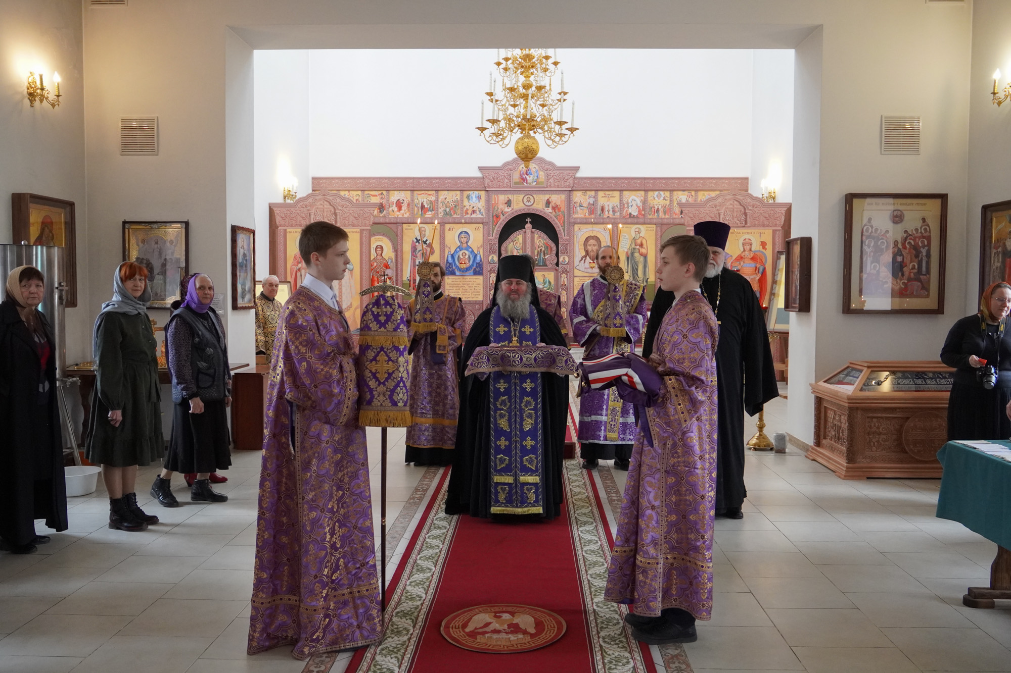 Его Преосвященству сослужили настоятель храма игумен Иоанн (Фощий), священник Андрей Мельчаков, священник Александр Тарсеев, диакон Тимофей Улямаев, диакон Сергий Бузанов, диакон Михаил Дутка.