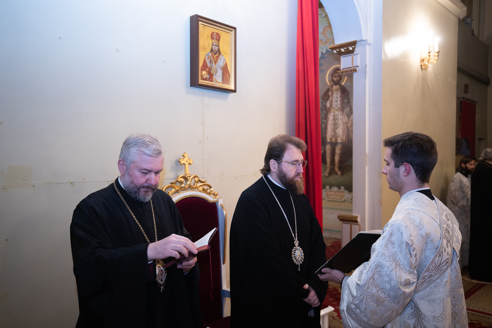 Архиереям сослужили ректор Саратовской православной духовной семинарии протоиерей Сергий Штурбабин; благочинный монастырей Саратовской епархии иеромонах Серафим (Баранов); клирик Вологодской епархии, ректор Вологодской духовной семинарии протоиерей Алексий Ольховников; секретарь Саратовского епархиального управления, благочинный Саратовского Центрального округа, настоятель Духосошественского собора г. Саратова иерей Александр Чеботарёв; благочинный Саратовского Северного округа, председатель финансово-хозяйственного управления Саратовской епархии, настоятель собора иерей Олег Грушин; клирик собора, директор Покровской православной классической гимназии имени святого благоверного князя Александра Невского г. Саратова иерей Ярослав Коздринь; ключарь собора иерей Сергий Филимонов; помощник настоятеля собора, заместитель председателя финансово-хозяйственного управления Саратовской епархии иеромонах Даниил (Дурягин); директор Архиерейского мужского хора, председатель церковно-общественного совета Саратовской епархии по развитию церковного пения и хоровых коллективов, директор Сводного праздничного митрополичьего хора иерей Иоанн Козлов; клирик собора, духовный попечитель — заместитель директора по воспитательной работе Покровской православной классической гимназии имени святого благоверного князя Александра Невского г. Саратова иерей Александр Салямов; клирик собора, пресс-секретарь Саратовской епархии иерей Михаил Фёдоров; клирик Шахтинской епархии иерей Михаил Дубянский; клирик Свято-Троицкого кафедрального собора г. Саратова протодиакон Александр Пушкарёв; клирик Казанского храма г. Саратова протодиакон Олег Дроздов; клирики собора диакон Иоанн Пушкарёв, диакон Вячеслав Кривов; клирик храма в честь Рождества Христова г. Балаково диакон Михаил Дутка; клирик собора диакон Антоний Долин.