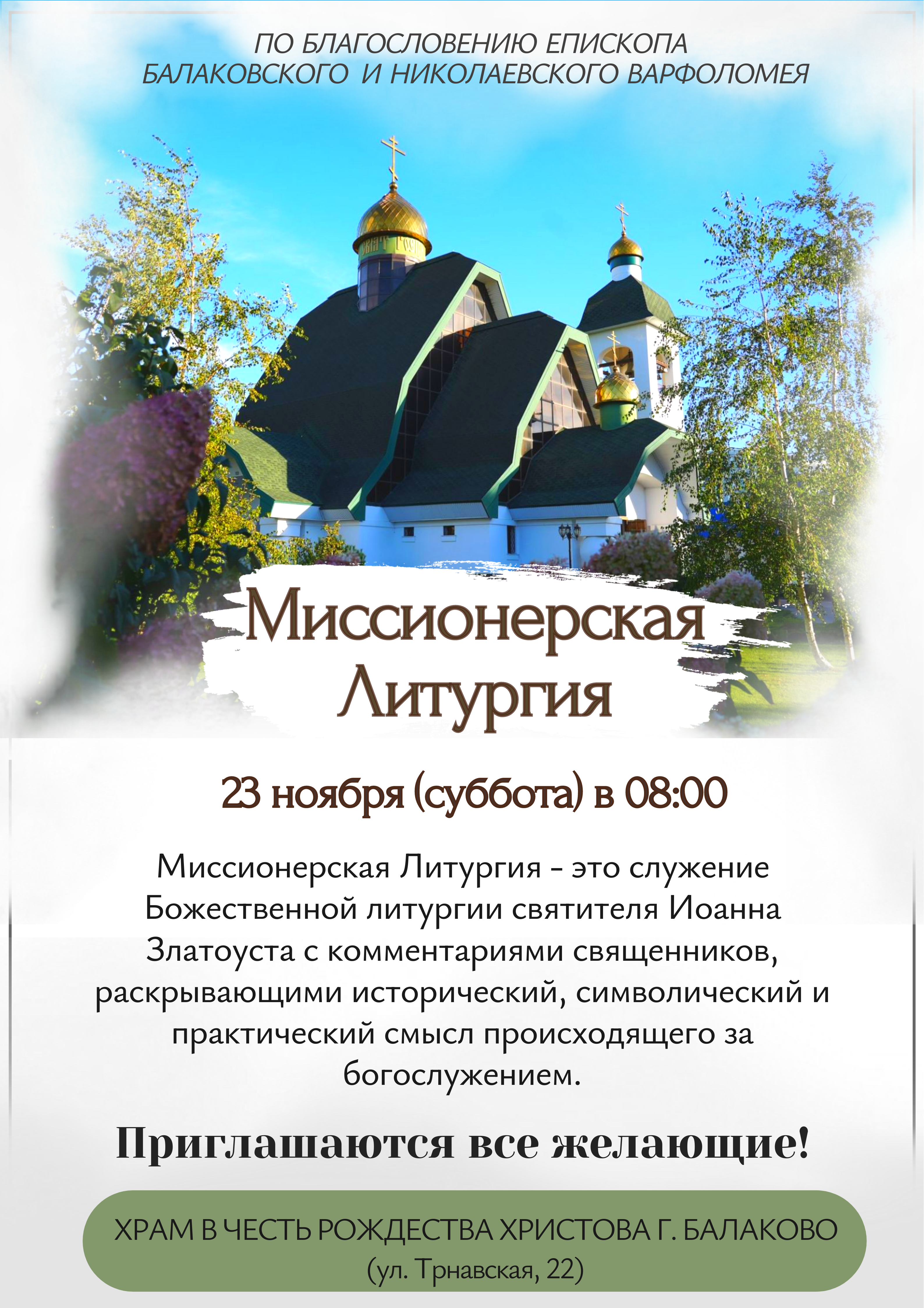 23 ноября по благословению епископа Балаковского и Николаевского Варфоломея в храме в честь Рождества Христова города Балаково состоится миссионерская Божественная литургия с пояснениями, раскрывающими её смысл и символику священнодействий.