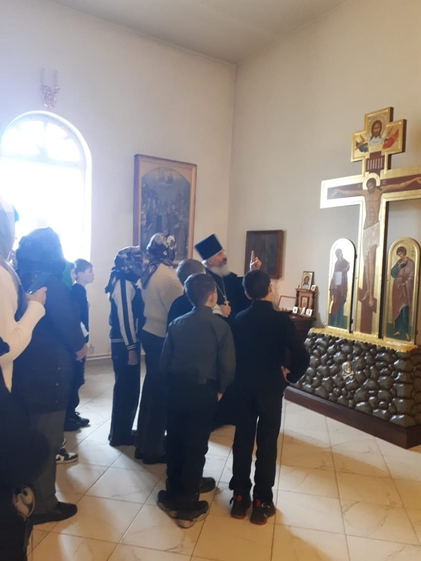 В храме ребят встретил настоятель протоиерей Валерий Генсицкий. Отец Валерий в том числе рассказал и о первородном грехе, о Великом потопе, ковчеге Ноя и завете Бога с человечеством. Далее батюшка ответил на вопросы детей об Иисусе Христе и тайне Его воплощения. У Голгофского Креста священник рассказал детям о земной жизни, смерти и Воскресении нашего Спасителя, а у иконы Иисуса Христа – о Его делах, чудесах, заповедях и служении людям.