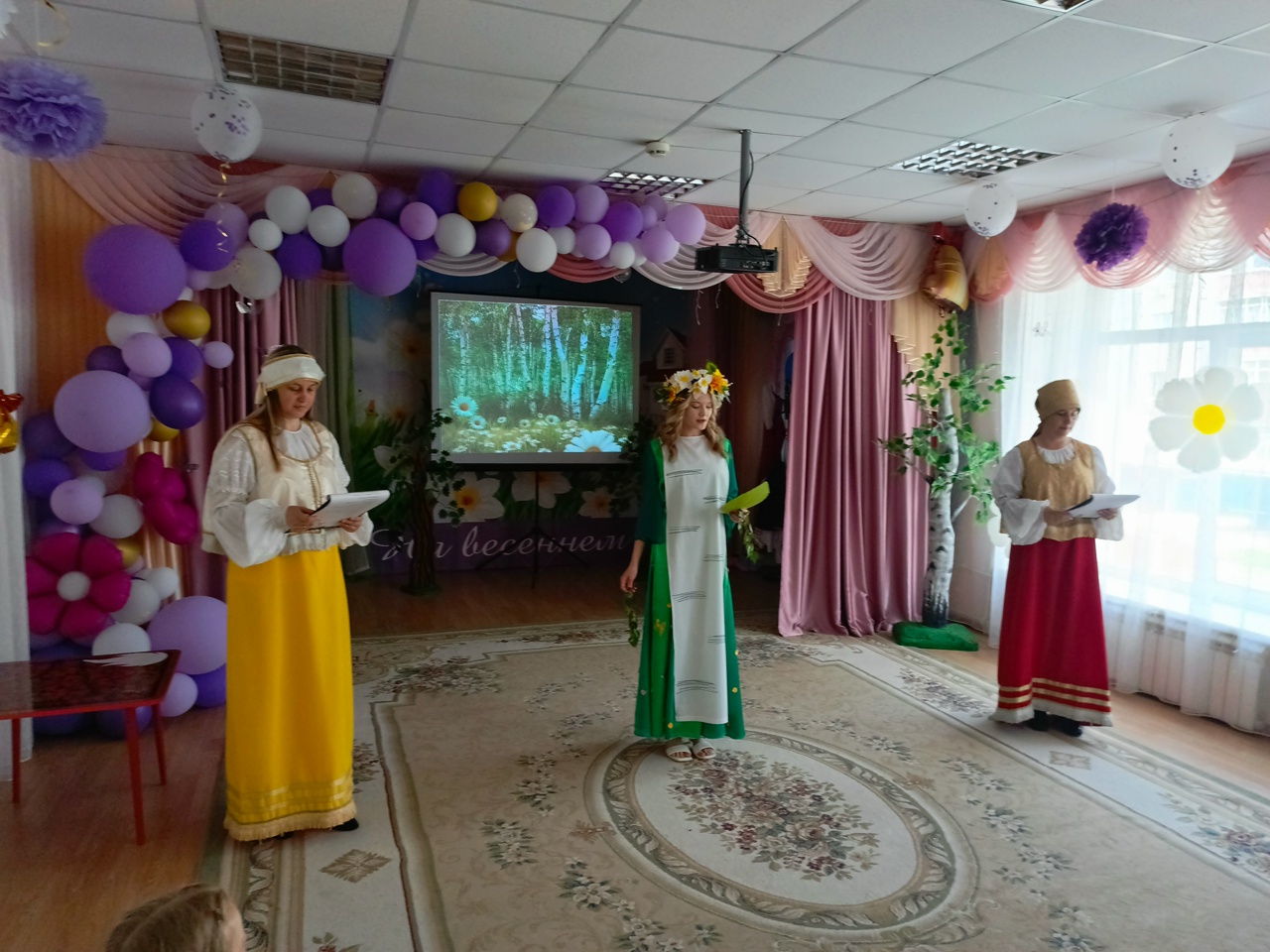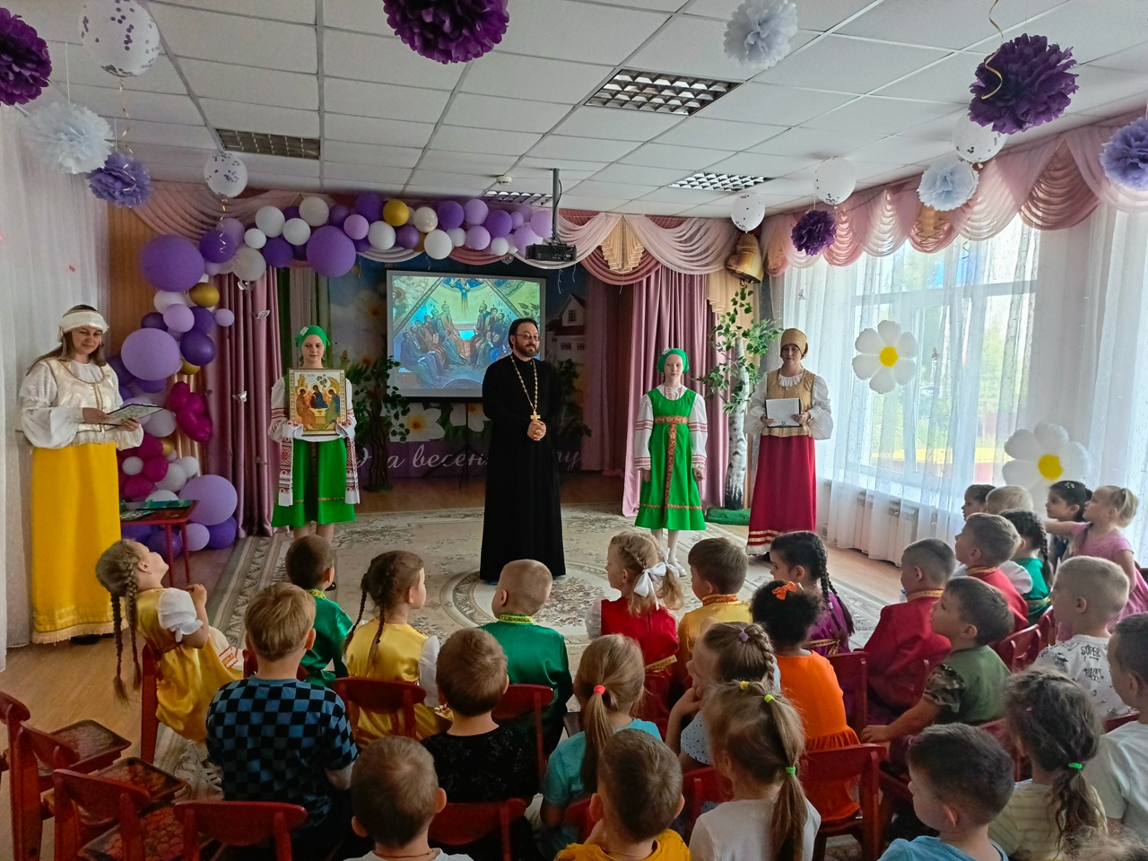 Гостями праздника стали клирик Свято-Троицкого кафедрального собора иерей Сергий Сафаров и воспитанники воскресной школы «Девора». Отец Сергий и ребята из воскресной школы рассказали маленьким слушателям о Сошествии Святого Духа на апостолов и об иконе Святой Троицы, написанной преподобным Андреем Рублевым, которая является самым известным произведением русской иконописи.