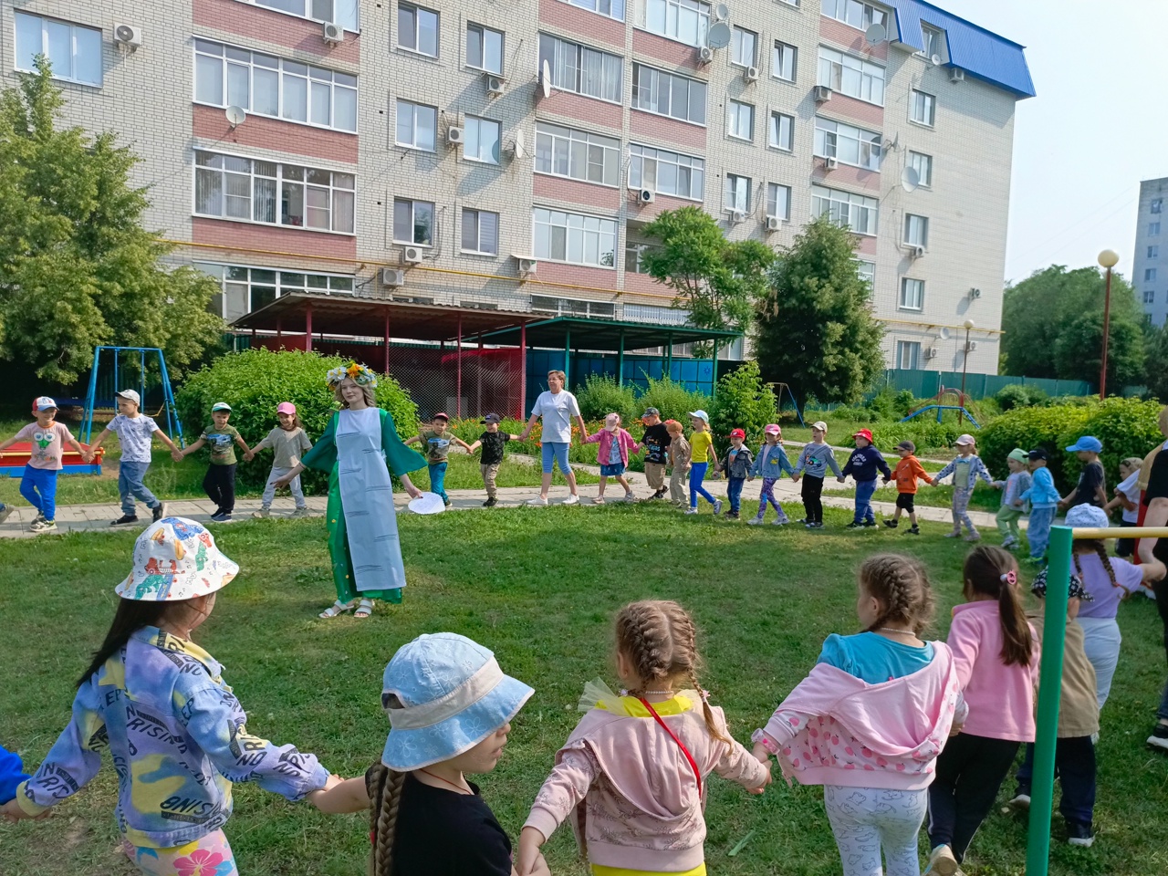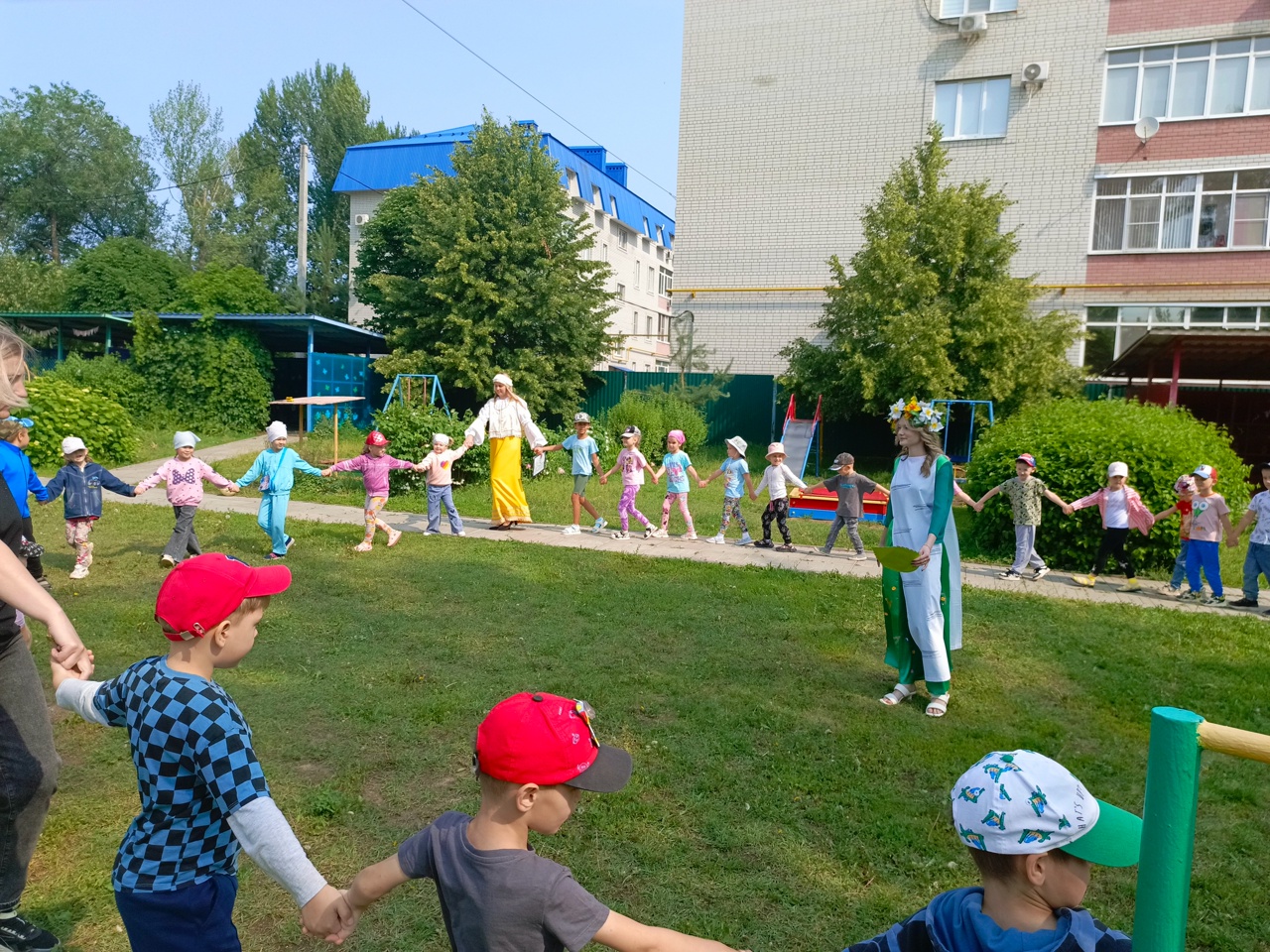 Затем для всех групп детского сада праздник продолжился на улице фольклорными играми с хороводами и песнями.