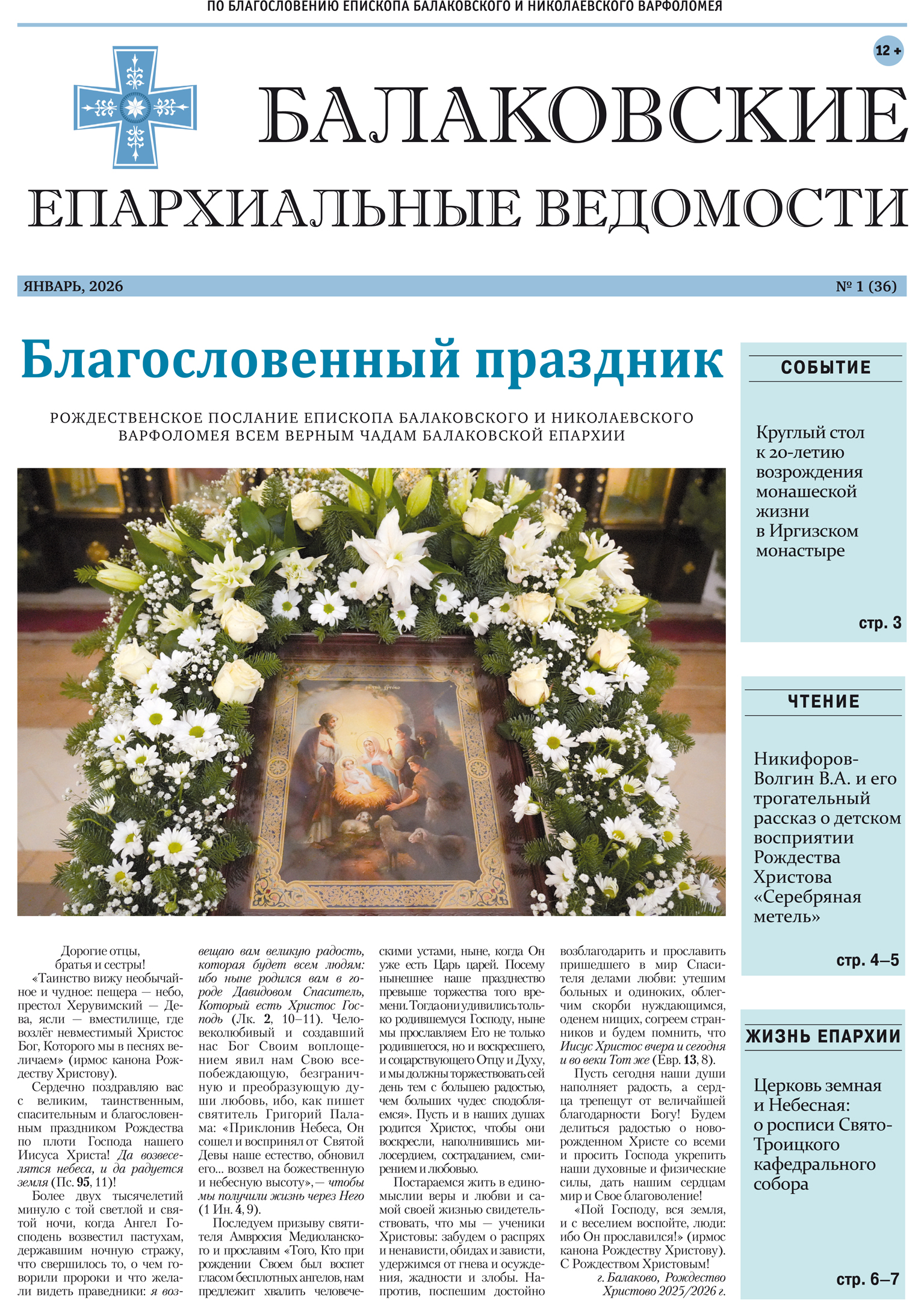 3 января вышел новый номер печатного издания Балаковской епархии «Балаковские епархиальные ведомости» (№ 1 (36) июнь 2026 г.). На первой полосе выпуска опубликовано слово епископа Балаковского и Николаевского Варфоломея «Благословенный праздник», посвященное празднику Рождества Христова.