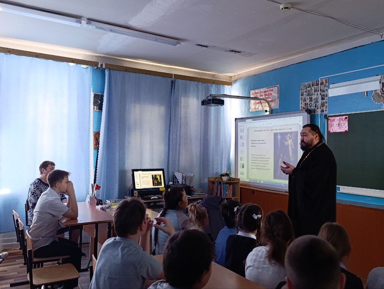 В ходе беседы школьники узнали о евангельских событиях — от Рождества Христова до Крещения Господня, а также о важности и смысле Боговоплощения.