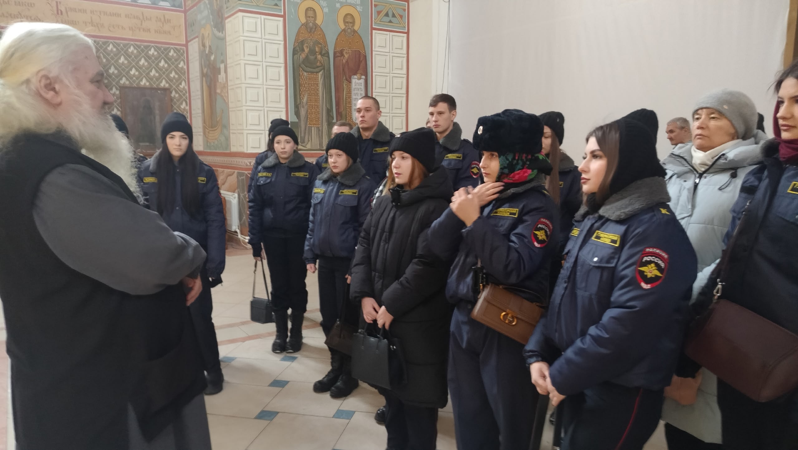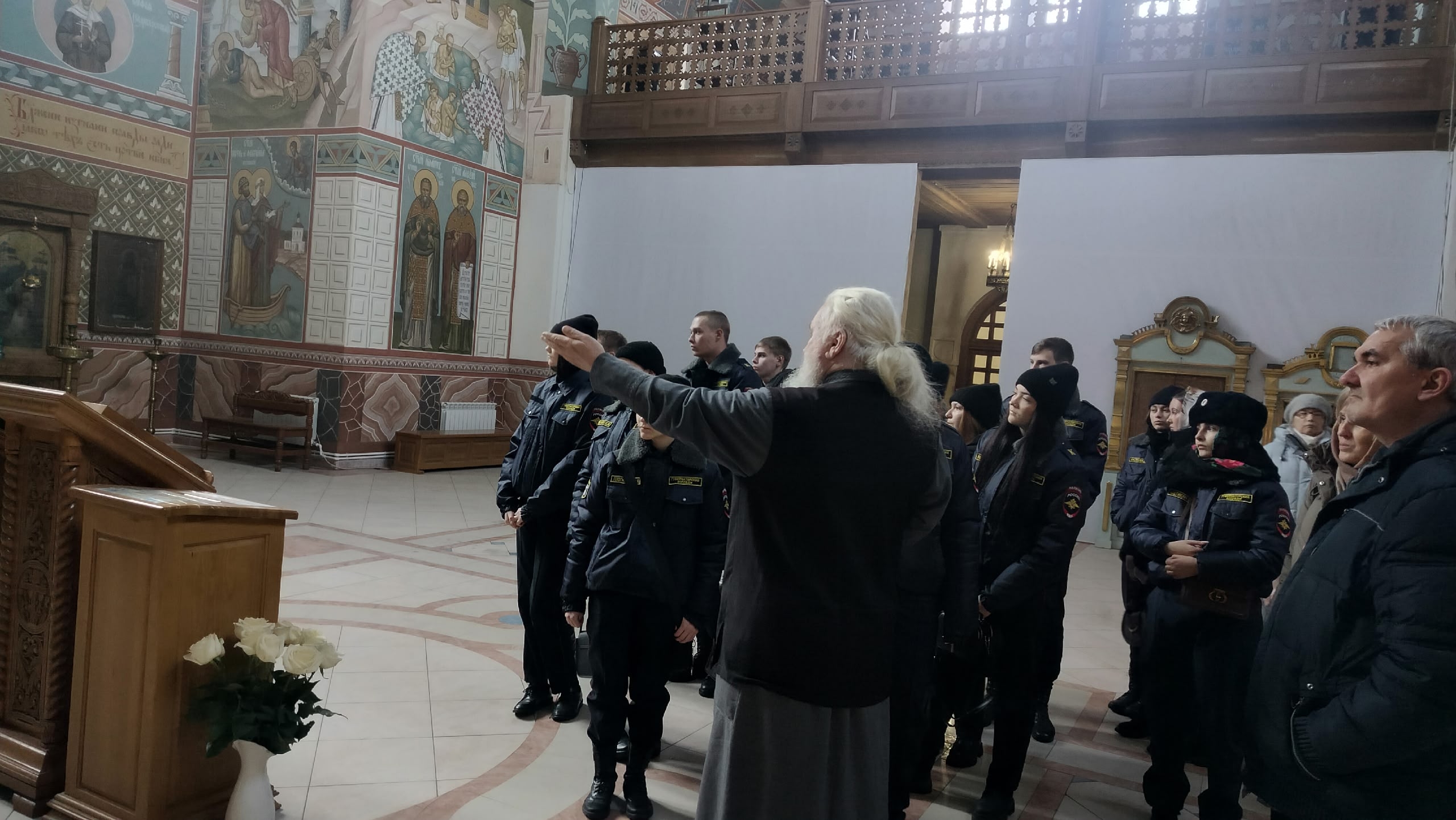 Экскурсию для курсантов провел настоятель собора архимандрит Амвросий (Волков). Отец Амвросий рассказал ребятам об истории храма, архитекторе Федоре Осиповиче Шехтеле, по проекту которого и построен собор, об иконах собора, росписях основного придела, об изображенных Саратовских святых и о дальнейших планах по реставрации и росписи кафедрального собора.