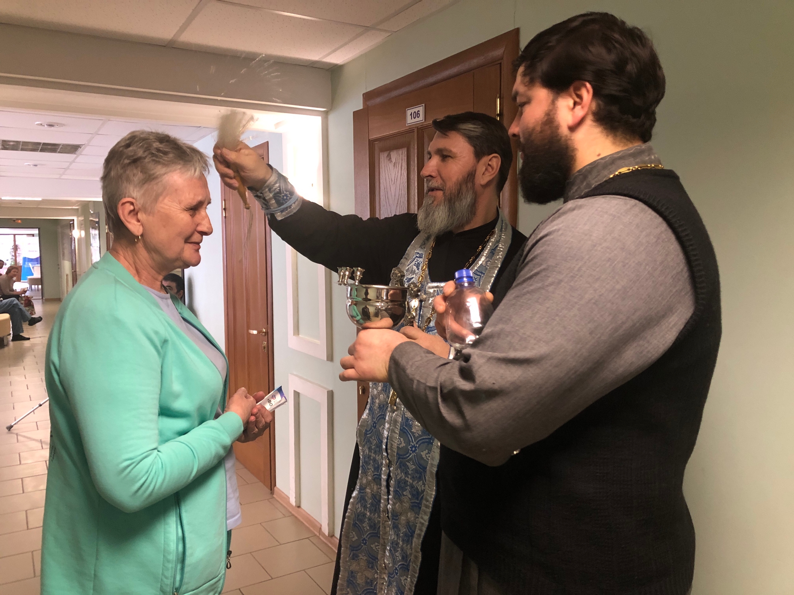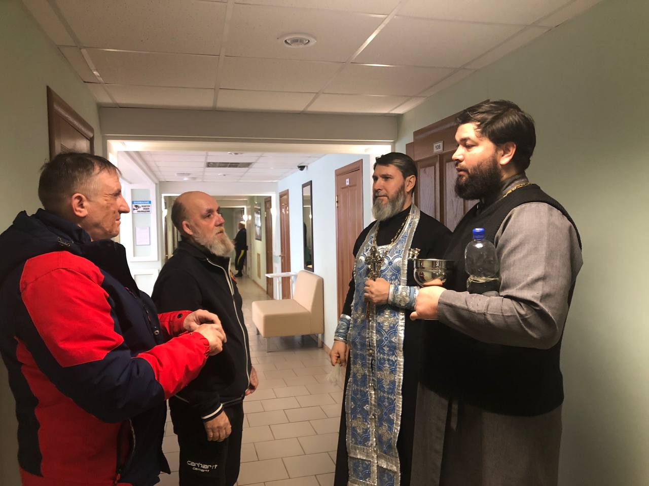 Священники совершили водосвятный молебен для подопечных Центра и окропили молящихся святой водой. Затем состоялась беседа священников с сотрудниками учреждения и пациентами, многие из которых являются ветеранами боевых действий.