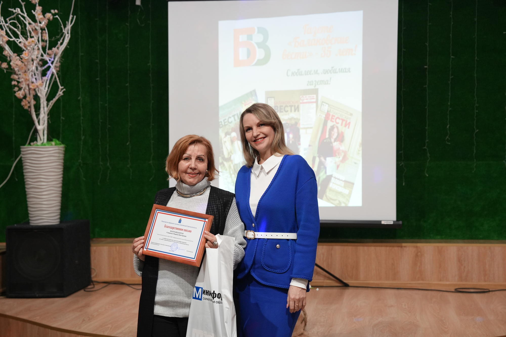 20 февраля в Городском центре искусств г. Балаково состоялось торжественное мероприятие, посвященное 35-летию газеты «Балаковские вести». С приветственными словами обратились заместитель министра информации и массовых коммуникаций Саратовской области М.С. Маламанова, и.о. заместителя главы администрации Балаковского муниципального района по социальным вопросам И.А. Бондарева председатель Собрания Балаковского муниципального района К.Б. Кузнецов.