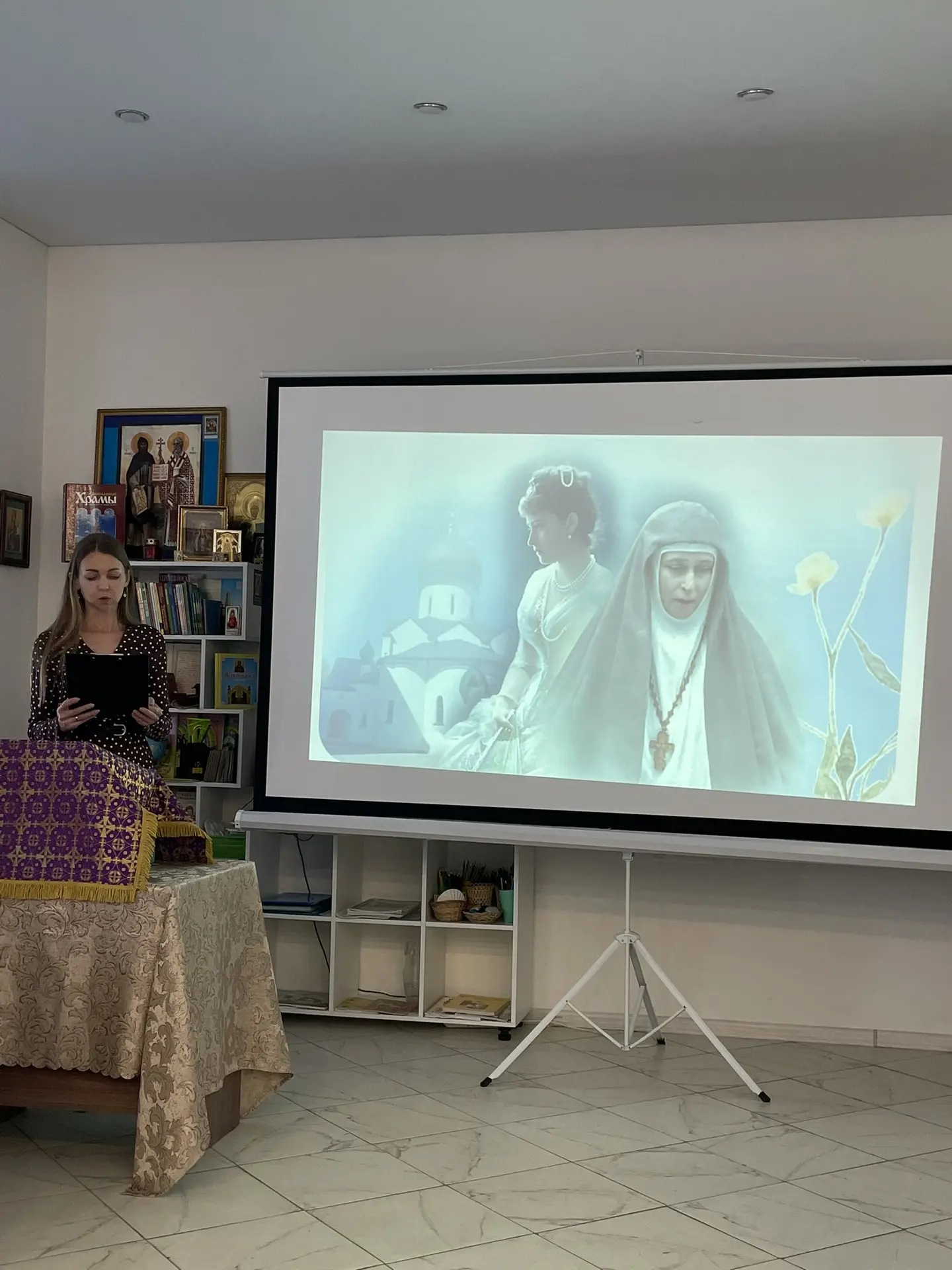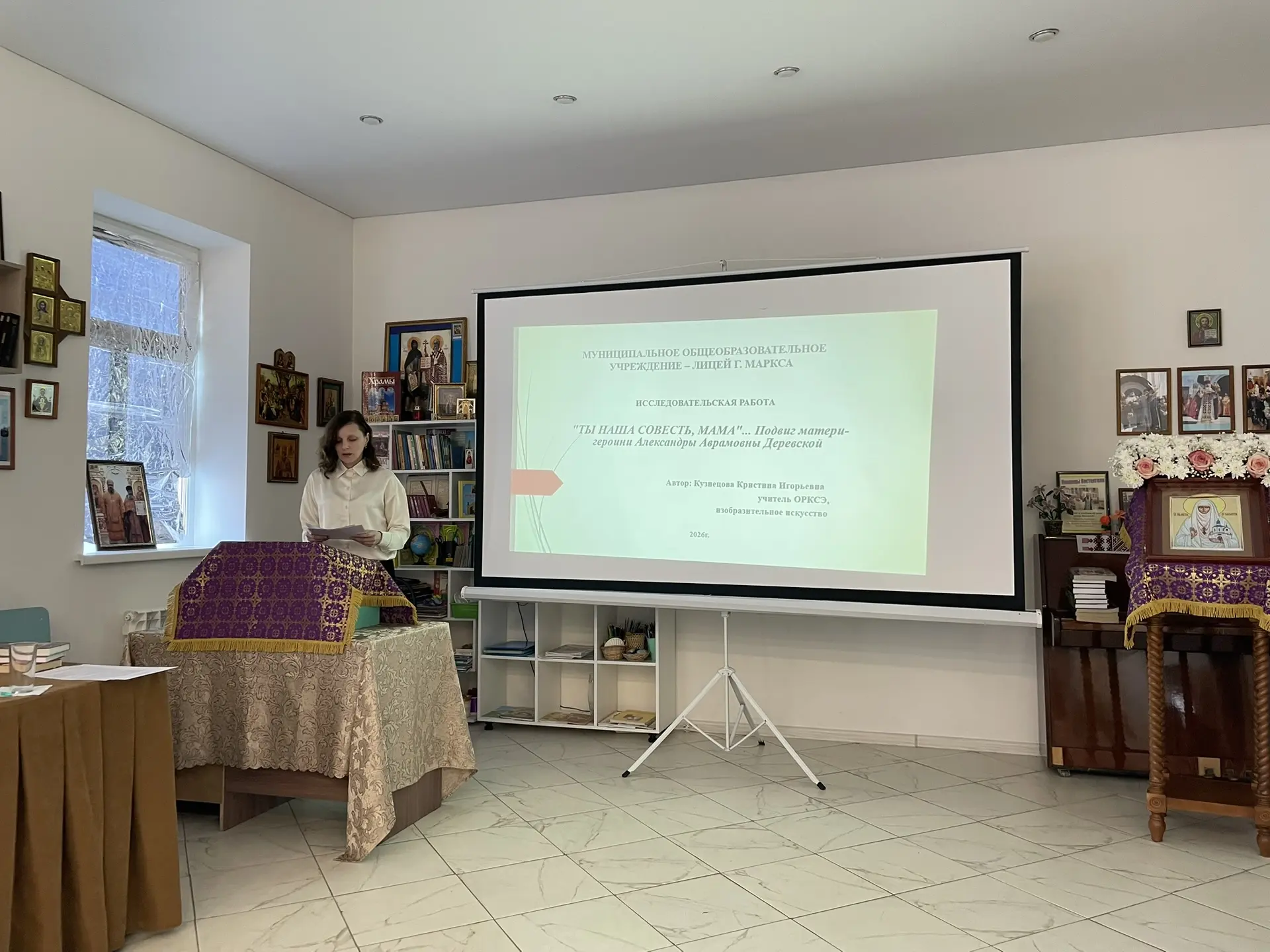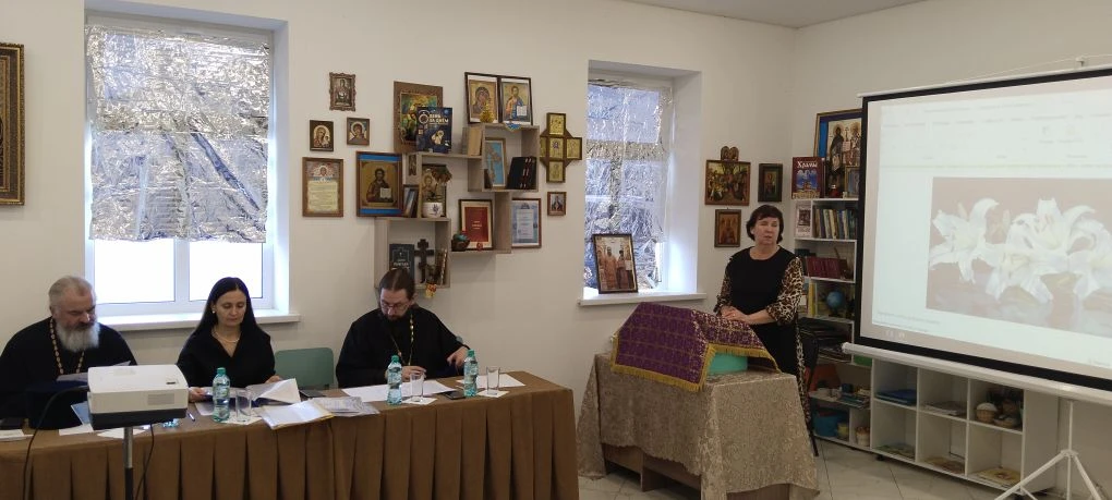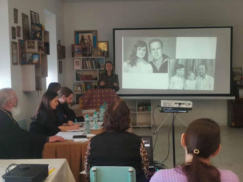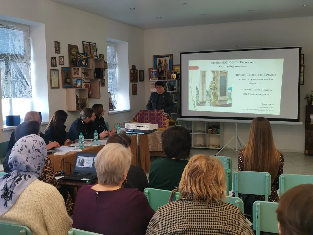 Руководитель районного методического объединения учителей ОРКСЭ и ОДНКНР, помощник благочинного Екатериненштадтского округа по религиозному образованию и катехизации, директор воскресной школы «Ставрос» Свято-Андреевского храма г. Маркса Тамара Кацуба подготовила презентацию с детскими фотографиями семей, представленных на чтениях. Сотрудник библиотеки Светлана Андреева ознакомила участников мероприятия с литературой по тематике помощи детям-сиротам, представив издания, среди которых были книги «Сын полка» и «Дети подземелья», и предложила ознакомиться с выставкой соответствующей литературы в библиотеке.