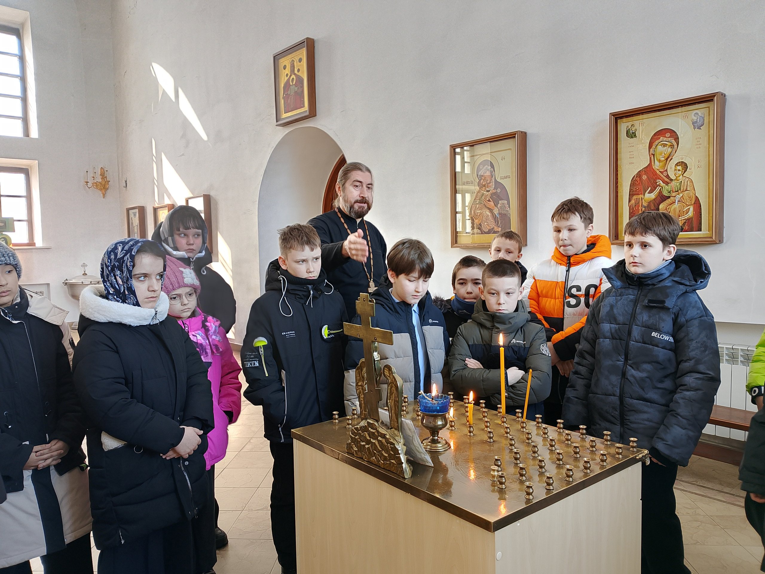 13 марта в храме в честь иконы Пресвятой Богородицы «Державная» п. Горный Краснопартизанского района состоялась экскурсия для учащихся 4 класса общеобразовательной школы поселка Михайловский. Настоятель храма протоиерей Александр Кашулин познакомил юных гостей с устройством иконостаса, святынями (древней иконой Богородицы и образом Николая Чудотворца), а также рассказал о церковных таинствах.