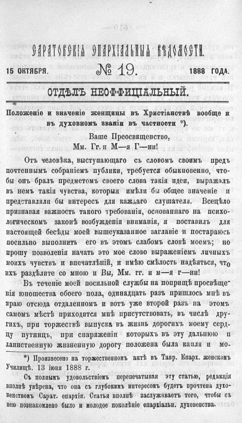 Известно, что статья «Положение и значение женщины в христианстве вообще и в духовном звании в частности» — это речь, произнесенная П.?Смирновым на торжественном акте в Таврическом епархиальном женском училище 13 июня 1888 года (училище находилось при Симферопольской семинарии). Также в примечании к статье отмечено: «С полным удовольствием перепечатывая эту статью, редакция вполне уверена, что она с глубоким интересом будет прочтена духовенством Саратовской епархии. Статья вполне заслуживает того, чтобы с нею познакомлено было и молодое поколение епархиального духовенства».