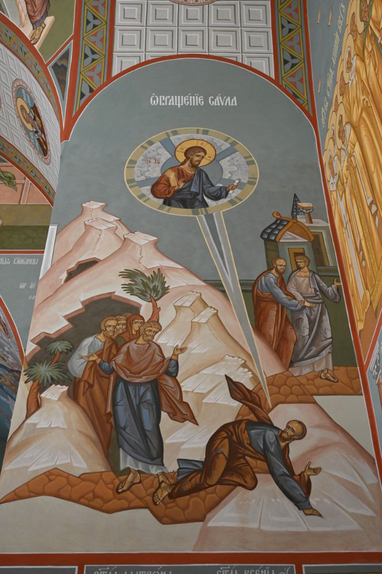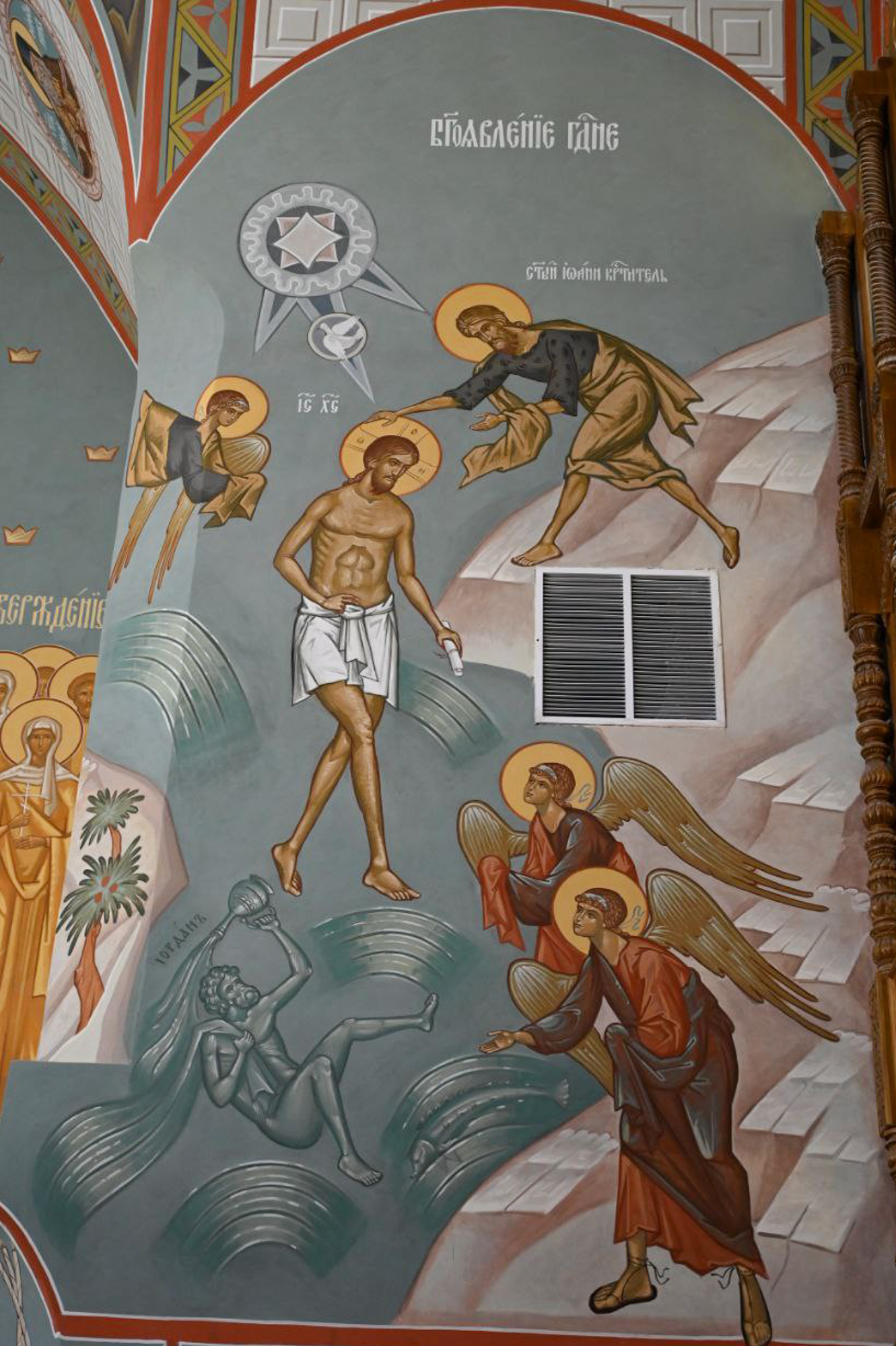 На массивных угловых столбах владыка Варфоломей благословил написать композиции, которые так или иначе связаны с деяниями Святой Троицы. Справа и слева от иконостаса изображены двунадесятые праздники Крещение Господне и Преображение Господне, в которых была явлена полнота Троицы.