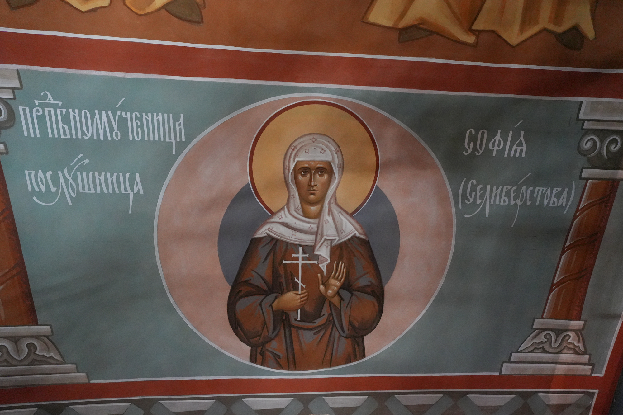 Тема единства Церквей Небесной и земной продолжается по северной и южной стенам. Это написанный в золотистом ключе сонм святых нашей Российской Церкви. Они изображены в молитвенном предстоянии Богу как участники богослужебного действия, которое неусыпно совершается в храме. Над собором Российских святых по благословению епископа Варфоломея написан текст из стихиры святителя Афанасия (Сахарова) (служба «Всем святым, в земле Российской просиявшим»): «Русь святая, храни веру православную, в ней же тебе утверждение». Подчеркну, что идея изобразить сонм русских святых на северной и южной стенах принадлежит именно Ф. Шехтелю. Мы же в меру сил постарались соблюсти преемственность в духовном обновлении собора.
