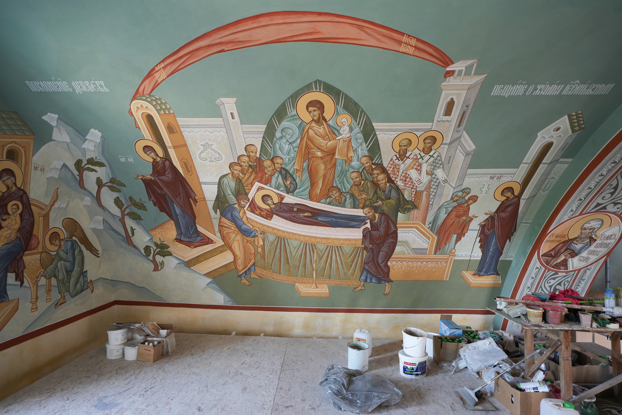 Сейчас мы с вами стоим на хорах. Живопись клироса посвящена Матери Бога нашего Пресвятой Богородице. Жизнеописание земного пути Пресвятой Девы Марии нам представляется писать тоже далеко не в каждом храме. Особенно это касается так называемых предуспенских сюжетов, которые мы изобразили справа и слева от композиции «Успение Богородицы»: «Поклонение деревьев» и «Прощание с женами Иерусалимскими». Эти сюжеты есть на древних иконах Богородицы с житием, но в современной иконописи встречаются редко.