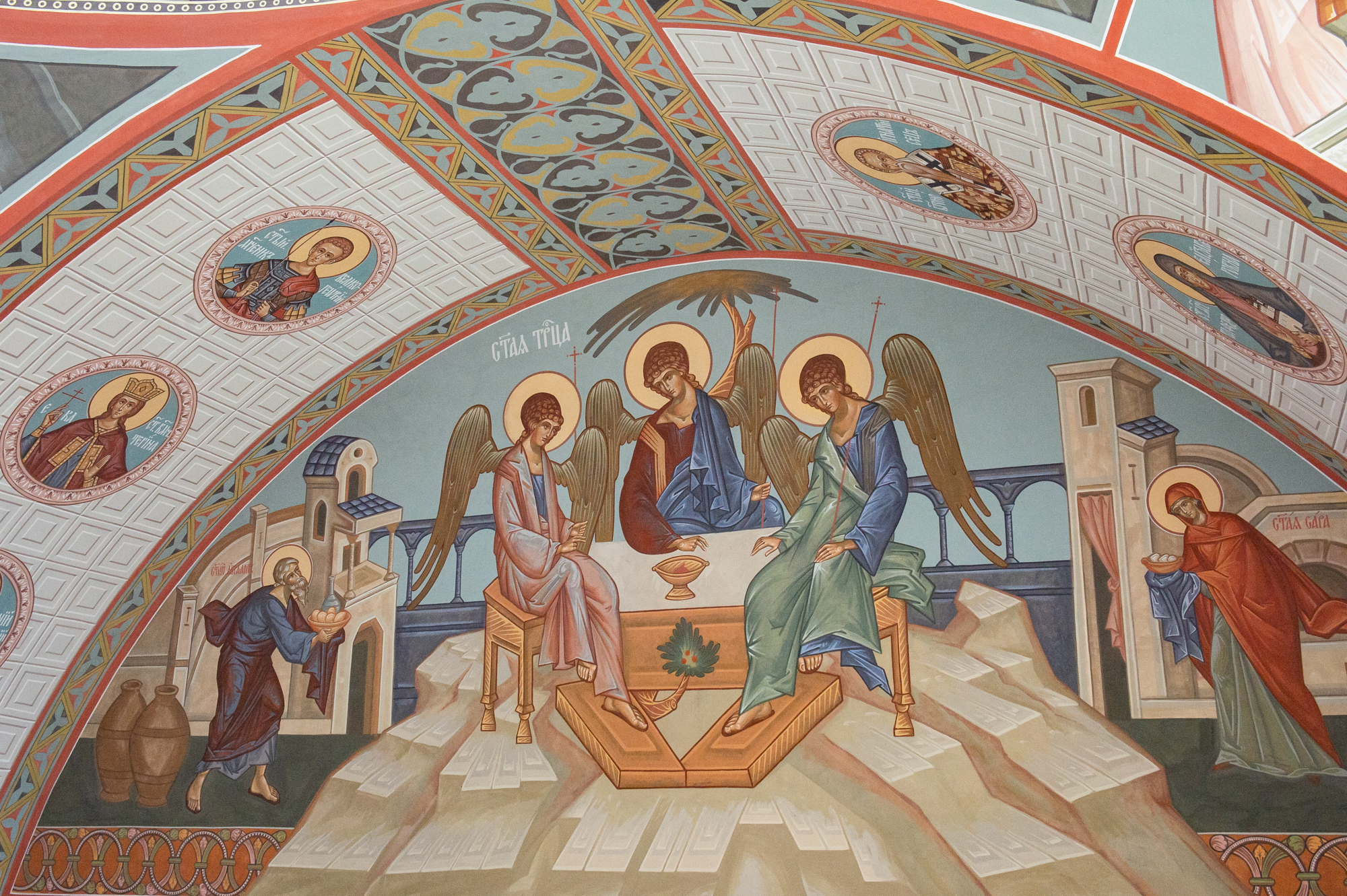 Образ Святой Троицы, написанный над иконостасом, подан в иконографии «Гостеприимство Авраама». По благословению епископа Варфоломея в арке над Троицей — святые мученики, ведь Церковь стоит на плечах мучеников.